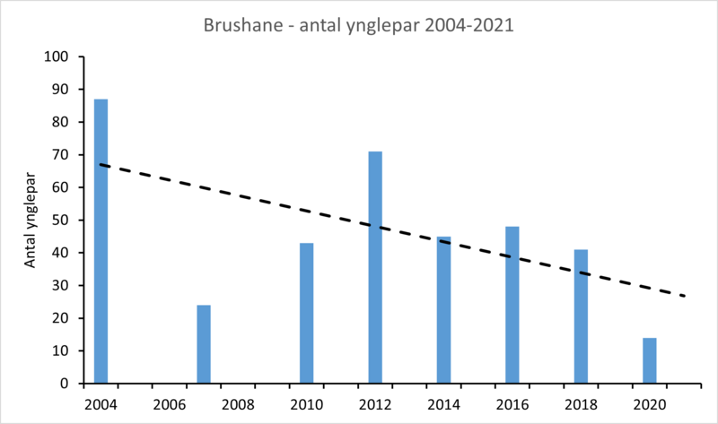 Antallet af ynglende brushane var i 2020 på 14 sikre og sandsynlige par, hvilket er et kraftigt fald i forhold til 2018, hvor der blev registreret 41 par (Figur 1, Tabel 1).
