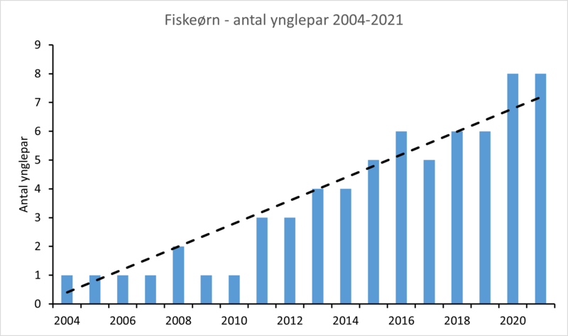 Fiskeørn forsvandt som ynglende for godt 100 år siden, men genindvandrede i 1994. I NOVANA-perioden 2004-2021 har bestanden været signifikant stigende fra 1 par i 2004 til 8 par i 2021 (P<0,001), ligesom langtidsudviklingen 1980-2021 også har vist en stigning (P<0,05). Arten ynglede først ved Flyndersø i Vestjylland og har sidenhen bredt sig til Midtjylland og Sjælland (Vikstrøm & Moshøj 2020).