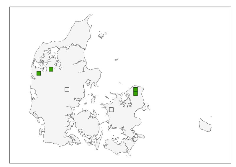 I NOVANA-overvågningen i 2020 og 2021 blev der begge år registreret 5 par (Figur 1, Tabel 1). Supplering af NOVANA-data med andre datakilder (Novrup 2021, Novrup 2022) viser, at den danske ynglebestand af fiskeørn sammenlagt var på 8 par i 2021 (Figur 2).