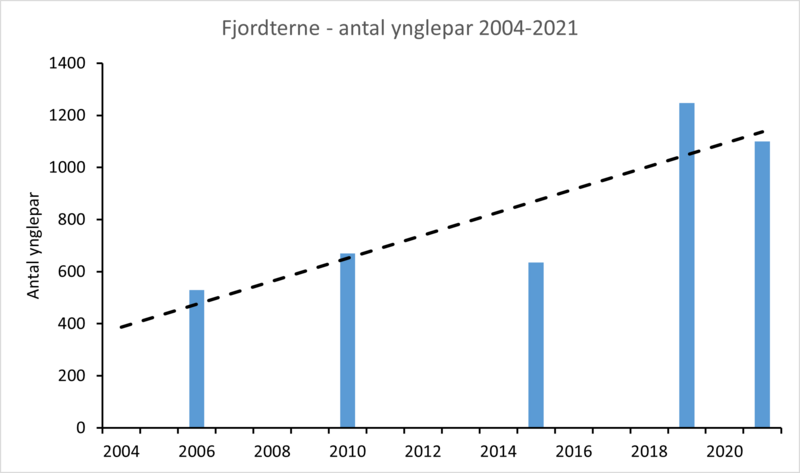 I perioden, hvor fjordterne er blevet overvåget i NOVANA-programmet, har bestanden været i fremgang (Tabel 1, T. Bregnballe upubl. data). Særligt efter 2015 er bestanden gået frem. Således blev der ved den landsdækkende overvågning i 2015 registreret 535 par, mens der ved næste landsdækkende overvågning i 2019 blev registreret 1.222-1.273 par.
