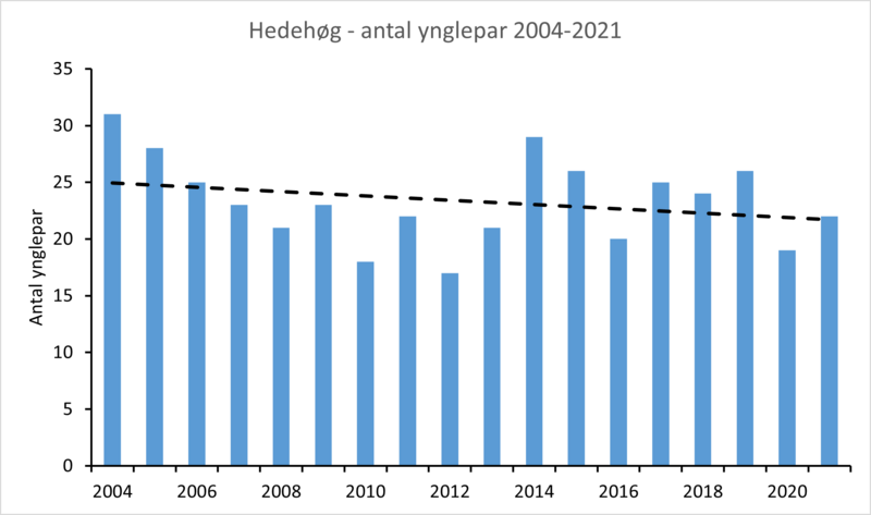 Forud for ”Projekt Hedehøg” er arten bl.a. blevet kortlagt ved en undersøgelse i 1968-1972, hvor bestanden blev anslået til 30-40 par ((Dybbro 1976, Jørgensen 1989). I 1980 registreredes 45 par (Sørensen 1995), i 1998 35-50 par (Grell 1998) og i 2004 til 35-45 par (Grell m.fl. 2004). Langtidsudviklingen i antallet af ynglepar siden 1980 har været stabil (P>0,05).