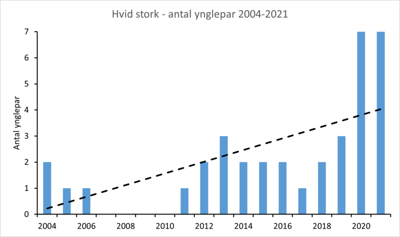 Hvid stork var tidligere en almindelig ynglefugl i Danmark, og bestanden er blevet anslået til ca. 4.000 par omkring år 1900 (Thellesen 2020). Efterfølgende er arten gået markant tilbage, og den oprindelige bestand blev erklæret uddød i 2008 af Dansk Ornitologisk Forening. Efterfølgende begyndte arten at yngle på Sjælland som følge af et svensk udsætningsprojekt, som i 2019 havde resulteret i 74 storkepar i Skåne (Nyegård m.fl. 2014; Lange 2020). I 2020 og 2021 blev der begge år registreret 7 storkepar, hvilket er det største antal i 25 år (Grell 1998, Lange 2021, Lange 2022).