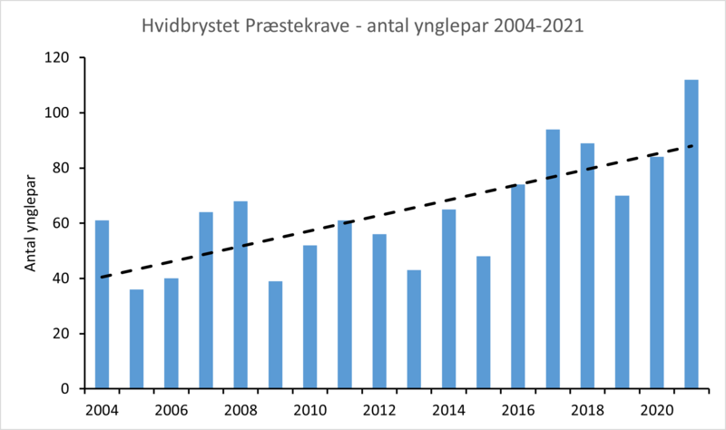 Der er i NOVANA-perioden alene registreret hvidbrystet præstekrave i Sydjylland (Figur 2). Antallene har varieret en del igennem perioden, men trenden er stigende. Arten har øjensynligt aldrig været talrig og faldt i antal fra ca. 136 par til ca. 119 par mellem 1969 og 1974 og videre til 30-40 par i 1991; tallet fra 1991 vurderes dog til at være et underestimat (Sørensen 1995, Grell 1998, Thorup & Bregnballe 2021). Den senest registrerede yngleforekomst af hvidbrystet præstekrave på en lokalitet i Danmark uden for Vadehavet er fra 1995 (Thorup & Bregnballe 2021). Antallet af hvidbrystet præstekrave har været overordnet stabilt siden 1980, men har i de seneste år vist højere antal end tidligere, så den samlede trend må betegnes som stigende.