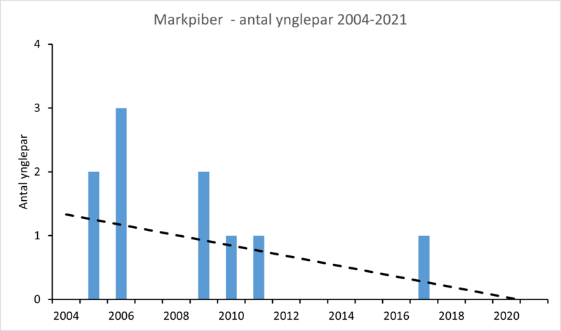 Der blev ikke registreret ynglepar af markpiber i NOVANA-overvågningen i 2012-2021 (Tabel 1, Figur 1).