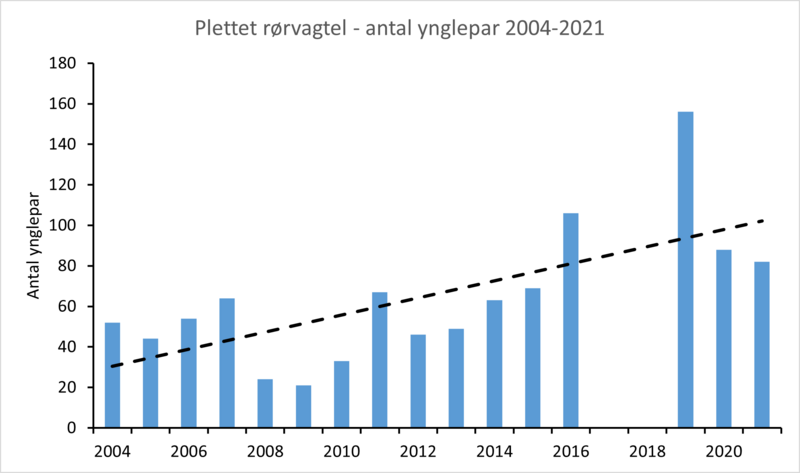 Ved at supplere NOVANA-data med andre datakilder, lander det samlede antal syngende hanner i 2021 på i alt 82 (Figur 2) (Lange 2022). Antallet af territoriehævdende plettede rørvagtler er steget siden 2004, hvilket nok kan tilskrives de naturgenoprettede vådområder i Vejlerne, Lille Vildmose, Skjern Å og Ribe Østerå, som har bidraget til de relativt store landstotaler.