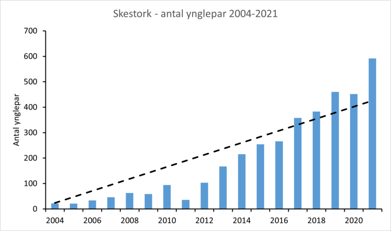 Skestork har tidligere ynglet på Klægbanken i 1900 og 1919 (Olsen 1992), og i Vejlerne har arten ynglet i flere perioder, både i 1920'erne, 1940'erne og sidst i årene 1962-1969 (Kjeldsen 2008). Arten genindvandrede som dansk ynglefugl i 1996, hvor enlige par ynglede to steder ved Limfjorden (Grell 1998). Siden har arten ynglet hvert år, og bestanden er stort set vokset år for år (Nyegaard m.fl. 2014, Bregnballe m.fl. 2022). Den danske bestand nåede over 100 par i 2011, over 200 par i 2014 og over 450 par i 2019 (Tabel 1). Den samlede danske bestand i 2021 kan på baggrund af resultaterne fra NOVANA-overvågningen kombineret med oplysninger fra områder, som ikke blev overvåget under NOVANA i 2019, opgøres til i alt 592 par fordelt på 5 lokaliteter (Bregnballe m.fl. 2022). Stigningen i bestanden er statistisk signifikant (P<0,001) både på kort sigt (2004-2021) og langt sigt (1980-2021).