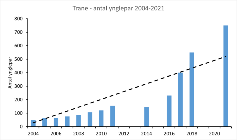I 2021, hvor trane i NOVANA alene blev overvåget i udpegede fuglebeskyttelsesområder, blev der registreret 147 ynglepar (Tabel 1). I Atlas III 2014-2017 blev bestanden opgjort til 413-546 ynglepar (Vikstrøm & Moshøj 2020). Den seneste estimering af landsbestanden er fra 2021, hvor det samlede antal ynglepar for hele landet blev vurderet til 750-900 (Figur 2) (Lange 2022). Siden 2010 har bestandsvæksten været på ca. 10 % årligt (Lange m.fl. 2018).