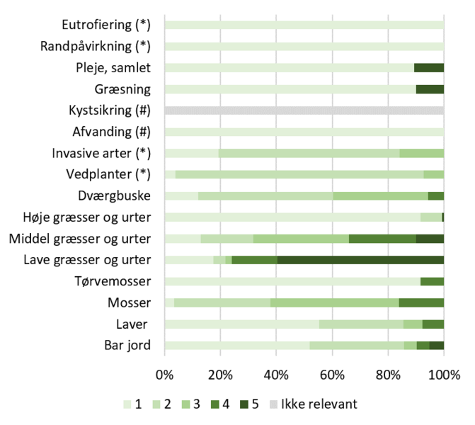 Fordelingen af strukturindikatorerne for den seneste kortlægning er vist i Figur 2330.103. Naturlige forstyrrelser, i form af græsning og erosion fra vinden, formår i nogen grad at skabe og fastholde åbninger i vegetation. Således har halvdelen af arealet med græs-indlandsklit en dækning af bar jord på mere end 5 %. På hovedparten af arealet er dækningen af laver under 10 %, mens mosserne er noget mere udbredte. Lave græsser og urter dominerer vegetationsdækket og middelhøje græsser og urter dækker mere end 10 % på to tredjedele af arealet, mens dværgbuske og høje græsser og urter er noget mere spredt forekommende. Vedplantedækningen er relativt lav, mens invasive plantearter er ret udbredte (se også Tabel 2330.104). Der er græsning på omtrent en ottendedel af arealet med græs-indlandsklit og ingen af de kortlagte arealer er forvaltet med høslæt eller slåning. Der er hverken registreret tydelig eutrofiering fra direkte gødskning og tilskudsfodring eller randpåvirkninger fra tilstødende marker. Omfanget af historisk og nutidig næringsstofbelastning er vanskelig at vurdere og i særdeleshed, når vurderingerne skal gøres i felten og på luftfotos samt på den skala kortlægningen foretages på. Vurderingerne af effekterne på habitattyperne vil derfor være forbundet med stor usikkerhed og vil sandsynligvis være underestimeret. Vurdering af tilgroning er lettere at foretage og dokumentere i felten baseret på ophobet plantemateriale og kolonisering af buske og træer.
