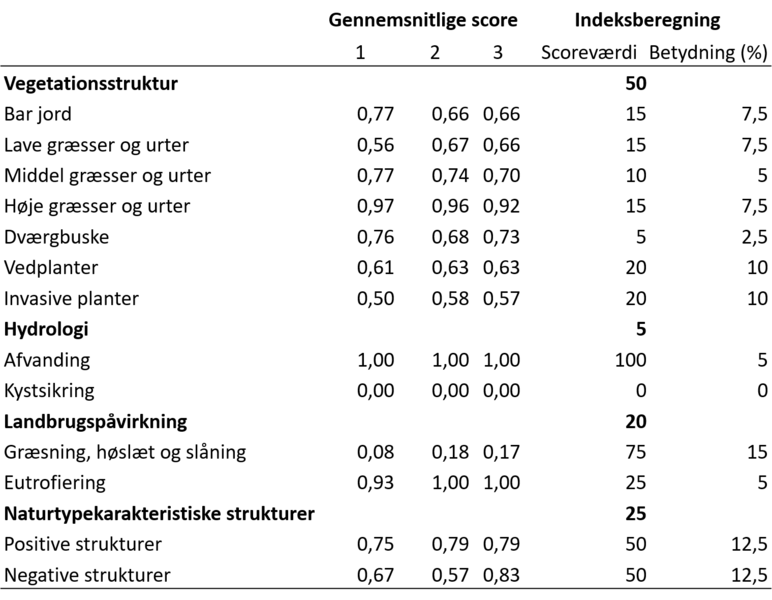 Strukturindekset er beregnet ud fra feltobservationer af en række indikatorer, der afspejler vegetationens struktur og påvirkningsfaktorer. Det gælder forekomsten af invasive plantearter, græsning/høslæt og en række naturtypekarakteristiske strukturer samt landbrugsmæssige påvirkninger. Strukturindikatorernes udbredelse på de kortlagte arealer er registreret i kategorier, der hver især tildeles en score i forhold til den optimale fordeling for naturtypen. Eksempelvis er den optimale tilstand i græs-indlandsklit en høj dækning af lave græsser og urter, en moderat dækning af barjord samt en lav dækning af høje græsser og urter (se Tabel 16-19 i Fredshavn og Nygaard 2014). Desuden vægtes indikatorerne indbyrdes i forhold til deres betydning for en gunstig tilstand for naturtypen. I græs-indlandsklit tillægges dækningen af dværgbuske, vedplanter og invasive plantearter, græsning, tegn på eutrofiering samt de naturtypekarakteristiske strukturer en relativt stor betydning for om strukturtilstanden er gunstig (se Tabel 2330.105).