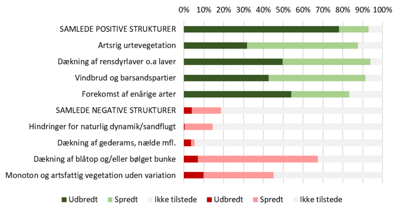 Som en del af strukturtilstanden er registreret en række positive og negative naturtypekarakteristiske strukturer, der er specifikke for den enkelte naturtype (link). Stor udbredelse af positive strukturer indikerer, at græs-indlandsklit har frie dynamiske processer (i form af græsning, brand, sandpålejring og erosion) og er relativt upåvirkede af kulturindgreb i form af eutrofiering, reduktion af sandflugt eller tilgroning. Stor udbredelse af negative strukturer indikerer, at græs-indlandsklitterne er stærkt kulturpåvirkede og at de dynamiske processer er begrænsede, eksempelvis ved fravær af græsning.