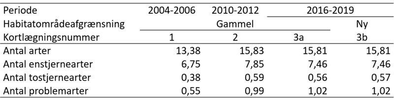 Det gennemsnitlige antal arter, en- og tostjernearter samt problemarter stiger gennem de tre kortlægninger (Tabel 2250.103). Disse forskelle kommer til udtryk i et mindre fald i artstilstanden, (Figur 2250.102).