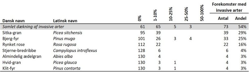 Der er registreret en eller flere invasive arter på godt halvdelen (54 %) af de kortlagte forekomster med enebærklit inden for habitatområderne (Tabel 2250.103). Og på blot 8 arealer med enebærklit er dækningen af invasive arter større end 10 %. Sitka-gran og bjerg-fyr udgør hovedparten af registreringerne og findes på mere end en fjerdedel af forekomsterne med enebærklit. Derudover er fundet rynket rose med en lav dækning på omtrent en sjettedel af forekomsterne, mens stjerne-bredribbe, almindelig ædelgran, hvid-gran og klit-fyr findes på ganske få lokaliteter.