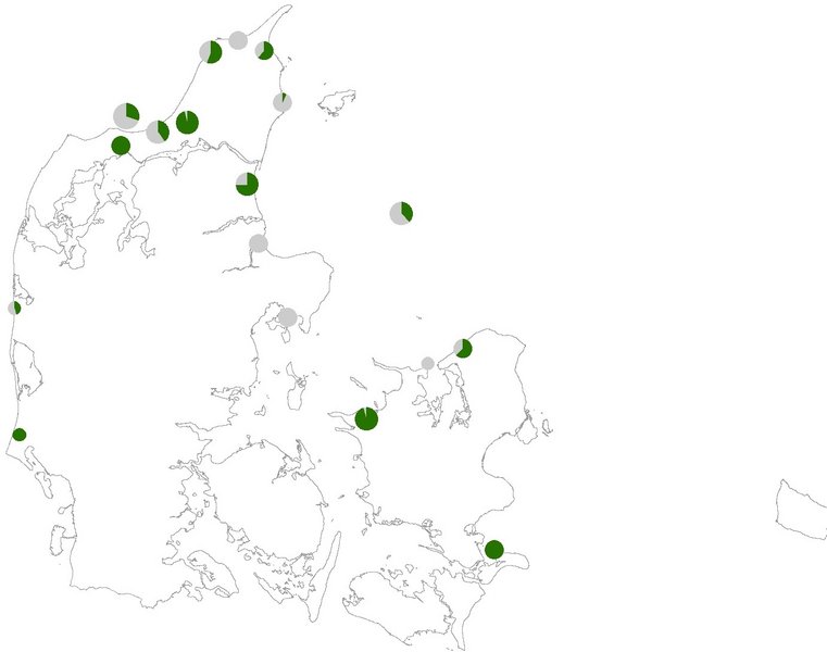 Den tredje kortlægning inden for den nye afgrænsning af habitatområderne (2016-2019) viser, at 54 % af arealet med enebærklit og blot 35 % af forekomsterne med naturtypen har høj eller god naturtilstand (se Figur 2250.102). Næsten to femtedele af arealet har moderat naturtilstand, ingen arealer har dårlig naturtilstand, mens 7 % af arealet og 12 % af forekomsterne har ringe naturtilstand og er dermed afhængige af en større indsats for at opnå en gunstig tilstand. Den gennemsnitlige indeksværdi for naturtilstand er på 0,55 for de 134 forekomster med enebærklit (Tabel 2250.102). Justeringerne af Natura 2000-områdernes grænser har ikke medført ændringer i den gennemsnitlige tilstand (Figur 2250.102 og Tabel 2250.102). Figur 2250.101 viser andelen af enebærklitterne i høj eller god naturtilstand i de 18 habitatområder, hvor naturtypen er kortlagt inden for de nye afgrænsninger. Det ses, at der er stor forskel på tilstanden i de forskellige habitatområder, men ingen tydelige geografiske mønstre i fordelingen.