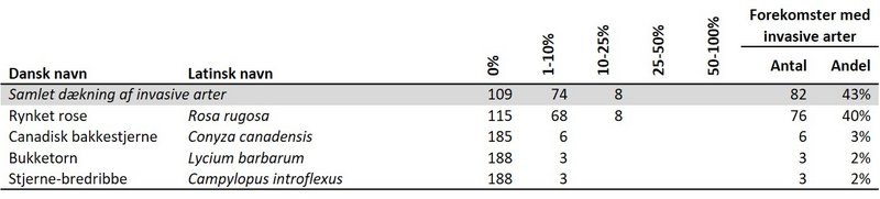 Der er registreret en eller flere invasive arter på to ud af fem (43 %) af de kortlagte forekomster med forklit inden for habitatområderne (Tabel 2110.104). Og på blot 8 arealer med forklit er dækningen af invasive arter større end 10 %. Rynket rose udgør langt hovedparten af registreringerne og findes på 40 % af forekomsterne med forklit. Derudover er fundet canadisk bakkestjerne, bukketorn og stjerne-bredribbe med en lav dækning på 2-3 % af forekomsterne.