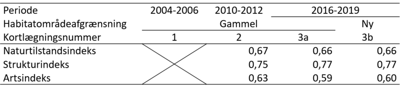 Naturtilstanden er en sammenvejning af naturtypens struktur- og artstilstand. Det er tydeligt at strukturtilstanden i forklitterne har trukket naturtilstanden op, mens artstilstanden er noget lavere. Således har 93 % af arealet høj eller god strukturtilstand, mens 77 % har en artstilstand i en af de to bedste tilstandsklasser. Det ses også af de gennemsnitlige indeksværdier, der ligger på hhv. 0,77 og 0,60 (Tabel 2110.102). Det gennemsnitlige naturtilstandsindeks (Tabel 2110.102) er nogenlunde uændret fra anden til tredje kortlægning, mens andelen af arealet i høj naturtilstand er øget. Der ses en lille stigning i strukturindekset, ligesom andelen af arealet i den bedste strukturtilstandsklasse øges fra anden til tredje kortlægning (se også afsnit om strukturindikatorerne), men der ses samtidig et fald i artsindekset og en faldende andel af arealet i høj artstilstand. Det skal bemærkes at det kortlagte areal er øget markant (se Tabel 2110.101). Da det kortlagte areal med forklit stiger markant fra anden til tredje kortlægning, kan de gennemsnitlige ændringer ikke direkte tages som udtryk for omfanget af de forandringer i tilstanden, der er sket inden for habitatområderne.