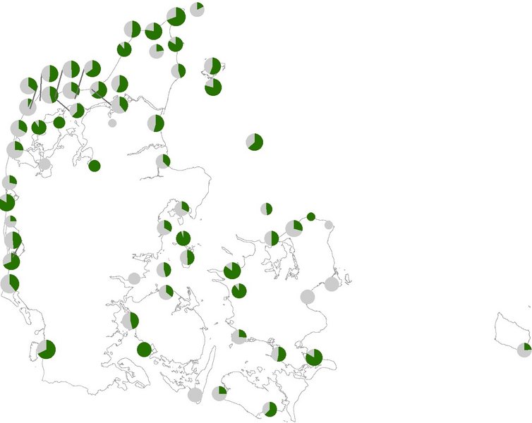 Den tredje kortlægning inden for den nye afgrænsning af habitatområderne (2016-2019) viser, at 54 % af arealet med grå/grøn klit og 42 % af forekomsterne med naturtypen har høj eller god naturtilstand (se Figur 2130.102). Ingen arealer har dårlig naturtilstand, mens 3 % af arealet og 9 % af forekomsterne har ringe naturtilstand og er dermed afhængige af en større indsats for at opnå en gunstig tilstand. Den gennemsnitlige indeksværdi for naturtilstand er på 0,56 for de 1.495 forekomster med grå/grøn klit (Tabel 2130.102). Justeringerne af Natura 2000-områdernes grænser har ikke medført ændringer i den gennemsnitlige tilstand (Figur 2130.102 og Tabel 2130.102). Figur 2130.101 viser andelen af grå/grønne klitter i høj eller god naturtilstand i de 63 habitatområder, hvor naturtypen er kortlagt inden for de nye afgrænsninger. Det ses, at der er stor forskel på tilstanden i de forskellige habitatområder, men ingen tydelige geografiske mønstre i fordelingen.