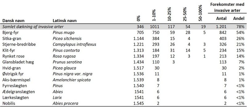 Klithede er en af de lysåbne terrestriske naturtyper med størst udbredelse af invasive arter. Der er således registreret en eller flere invasive arter på mere end tre fjerdedele (78 %) af de kortlagte forekomster med klithede inden for habitatområderne (Tabel 2140.103). Og på hele 190 arealer med klithede (12 %) er dækningen af invasive arter større end 10 %. Bjerg-fyr udgør langt hovedparten af registreringerne og findes på 54 % af forekomsterne med klithede. Derudover er fundet sitka-gran, stjerne-bredribbe, klit-fyr og rynket rose på 14-26 % af forekomsterne, mens glansbladet hæg, hvid-gran, arter af fyr (fx østrigsk fyr), aks-bærmispel, arter af ædelgran (fx almindelig ædelgran), arter af lærk (fx japansk lærk) og nobilis forekommer mere sporadisk.