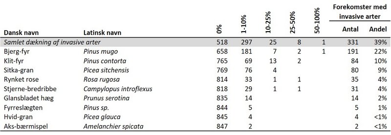 Der er registreret en eller flere invasive arter på to ud af fem (39 %) af de kortlagte forekomster med klitlavning inden for habitatområderne (Tabel 2190.103). Og på 34 arealer med klitlavning er dækningen af invasive arter større end 10 %. Bjerg-fyr udgør hovedparten af registreringerne og findes på 22 % af forekomsterne med klitlavning. Derudover er fundet klit-fyr og sitka-gran på omtrent 10 % af forekomsterne, mens rynket rose, stjerne-bredribbe, glansbladet hæg, arter af fyr, hvid-gran og aks-bærmispel findes på relativt få lokaliteter.