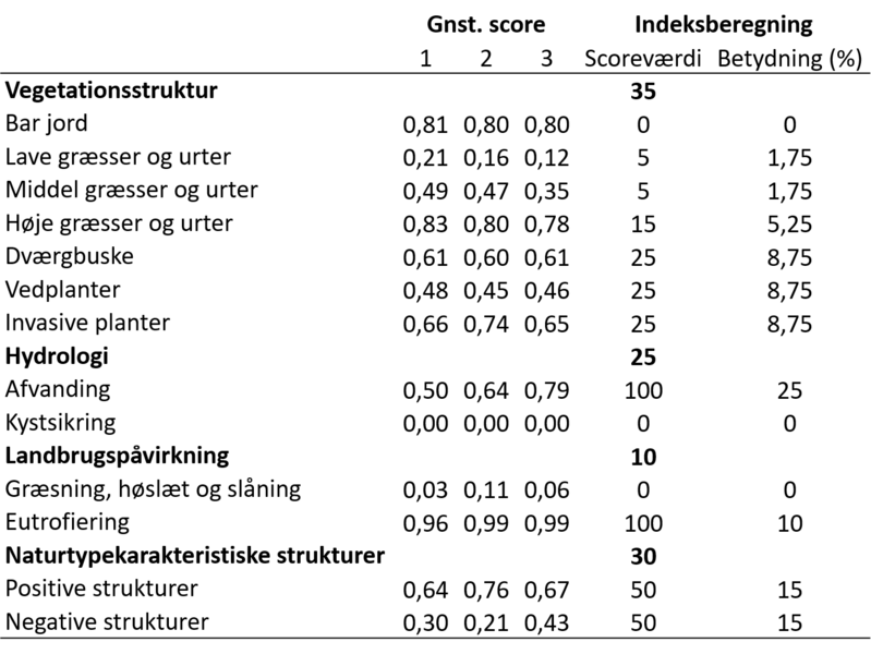 Strukturindekset er beregnet ud fra feltobservationer af en række indikatorer, der afspejler vegetationens struktur og påvirkningsfaktorer. Det gælder vegetationens højde og sammensætning af laver, mosser, urter, græsser, dværgbuske og vedplanter, forekomsten af invasive plantearter, tegn på græsning/høslæt, modifikationer af hydrologi og kystdynamik samt landbrugsmæssige påvirkninger og udbredelsen af en række naturtypekarakteristiske strukturer. Laver, mosser og tørvemosser indgår ikke i beregningerne af strukturtilstanden. Strukturindikatorernes udbredelse på de kortlagte arealer er registreret i kategorier, der hver især tildeles en score i forhold til den optimale fordeling for naturtypen. Eksempelvis er den optimale tilstand i aktiv højmose en høj dækning af lave græsser og urter, en moderat dækning af dværgbuske samt en lav dækning af høje græsser og urter (se Tabel 30-33 i Fredshavn og Ejrnæs 2009). Desuden vægtes indikatorerne indbyrdes i forhold til deres betydning for en gunstig tilstand for naturtypen. På aktiv højmose tillægges tegn på afvanding og eutrofiering, dækningen af dværgbuske, vedplanter og invasive plantearter samt de naturtypekarakteristiske strukturer en relativt stor betydning for om strukturtilstanden er gunstig (se Tabel 7110.105).