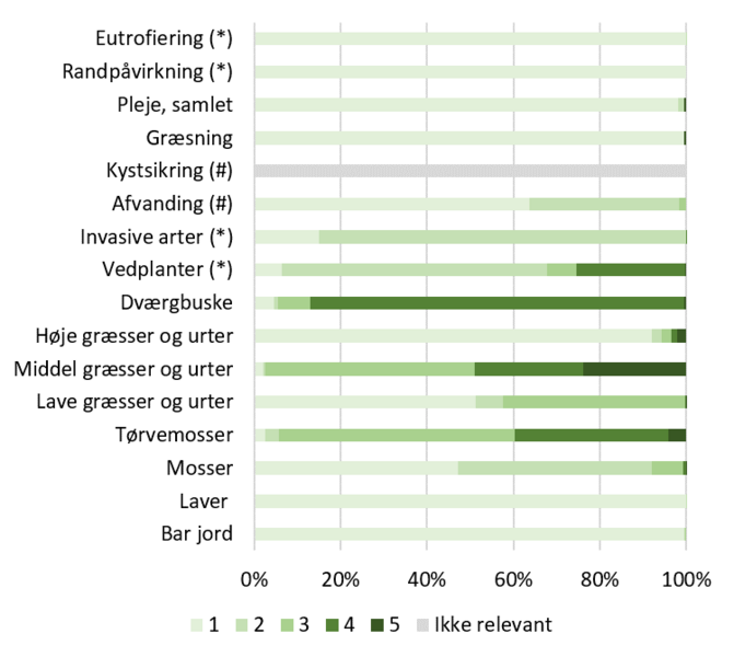 Fordelingen af strukturindikatorerne for den seneste kortlægning er vist i Figur 7110.103. Dækning af levende tørvemosser er relativt lav og på blot to femtedele af arealet med aktiv højmose er dækningen over 30 %. Til sammenligning dækker tørvemosser halvdelen af overfladen i kontrolovervågningens prøvefelter. Dækningen af øvrige mosser er relativt lav, og laver næsten fraværende. Dværgbuske dominerer vegetationsdækket, middelhøje græsser og urter som fx tue-kæruld er ret udbredte mens lave og høje græsser og urter er noget mere spredt forekommende. På enkelte forekomster er dominans af høje græsser og urter. Vedplantedækningen er relativt høj og en tredjedel af det kortlagte areal har en vedplantedækning over 10 % og ganske få forekomster er træløse. Det er uvist i hvor høj grad vedplanterne vokser på selve højmosefladen eller blot i højmosernes rand og laggzone (men se Figur 7110.104). Til sammenligning er vedplantedækningen relativt lav i kontrolovervågningens prøvefelter. Invasive plantearter er spredt forekommende på de aktive højmoser (se også Tabel 7110.104). Der er græsning på enkelte forekomster og der er ingen tegn på eutrofiering fra direkte gødskning og tilskudsfodring eller randpåvirkninger fra tilstødende marker. Der er registreret afvanding i form af perifere eller ikke-fungerende grøfter på næsten to femtedele af det kortlagte areal. Omfanget af historisk og nutidig næringsstofbelastning og betydningen af begrænsninger i den naturlige hydrologi ved afvanding og vandindvinding er vanskeligt at vurdere og i særdeleshed, når vurderingerne skal gøres i felten og på luftfotos samt på den skala kortlægningen foretages på. Vurderingerne af effekterne på habitattyperne vil derfor være forbundet med stor usikkerhed og vil sandsynligvis være underestimeret. Vurdering af tilgroning er lettere at foretage og dokumentere i felten baseret på ophobet plantemateriale og kolonisering af buske og træer.