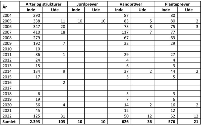 Tabel 7110.5b. Oversigt over antal registreringer af arter og strukturer samt indsamlinger af jord-, vand- og planteprøver i prøvefelter for aktiv højmose i perioden 2004-2022 hhv. inden for og uden for habitatområderne. I første programperiodes overvågning (2004-2010) blev prøvefelterne overvåget årligt på de intensive stationer og en gang i perioden på de ekstensive stationer. Prøvefelterne fra de gamle stationer (udlagt i 2004) blev overvåget to gange i anden programperiode (2011-2016), mens prøvefelterne fra de nye stationer (udlagt i 2011) blev overvåget en enkelt gang.