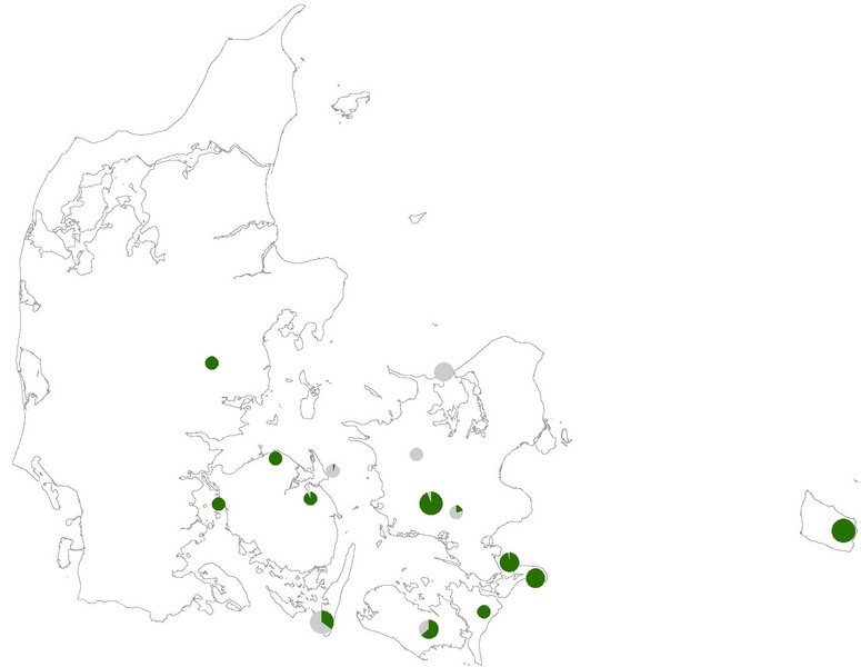 Den tredje kortlægning inden for den nye afgrænsning af habitatområderne (2016-2019) viser, at 68 % af arealet med avneknippemose og 63 % af forekomsterne med naturtypen har høj eller god naturtilstand (se Figur 7210.102). Blot et enkelt areal har ringe naturtilstand og er dermed afhængige af en større indsats for at opnå en gunstig tilstand. Den gennemsnitlige indeksværdi for naturtilstand er på 0,63 for de 41 forekomster med avneknippemose (Tabel 7210.102). Justeringerne af Natura 2000-områdernes grænser har ikke medført væsentlige ændringer i den gennemsnitlige tilstand (Figur 7210.102 og Tabel 7210.102). Figur 7210.101 viser andelen af avneknippemoserne i høj eller god naturtilstand i de 15 habitatområder, hvor naturtypen er kortlagt inden for de nye afgrænsninger. Det ses, at der er stor forskel på tilstanden i de forskellige habitatområder, men ingen tydelige geografiske mønstre i fordelingen.