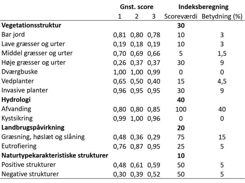 Strukturindikatorernes gennemsnitlige scorer i de tre kortlægningsrunder, og dermed afvigelsen fra en optimal strukturtilstand, er vist i Tabel 7220.105. Det er primært andelen af arealet med græsning, afvanding og dækningen af høje græsser og urter og vedplanter, der har trukket strukturindekset ned fra en optimal tilstand for naturtypen. Andre indikatorer, som eksempelvis dækningen af lave græsser og urter, er langt fra den optimale tilstand for naturtypen, men tillægges en lille betydning i beregningerne af strukturindekset. For hovedparten af indikatorerne er de gennemsnitlige scorer ikke væsentligt forskellige i de tre kortlægningsperioder, eller også er der ingen entydig trend, hvilket også kommer til udtryk i en nogenlunde uændret strukturindeks (se Figur 7220.101). Der ses dog et lille fald i scoren for middelhøj vegetation, dækningen af vedpanter samt i udbredelsen græsning, hvilket kunne tyde på ophørt græsning og øget tilgroning.