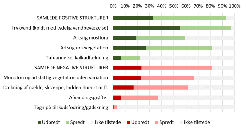 Som en del af strukturtilstanden er registreret en række positive og negative naturtypekarakteristiske strukturer, der er specifikke for den enkelte naturtype (link). Stor udbredelse af positive strukturer indikerer, at kildevæld har lang græsningskontinuitet, frie dynamiske processer (fx i form af oversvømmelser) og er relativt upåvirkede af kulturindgreb i form af eutrofiering, afvanding eller tilgroning. Stor udbredelse af negative strukturer indikerer, at kildevældene er stærkt kulturpåvirkede og at de dynamiske processer er begrænsede, eksempelvis ved fravær af græsning.