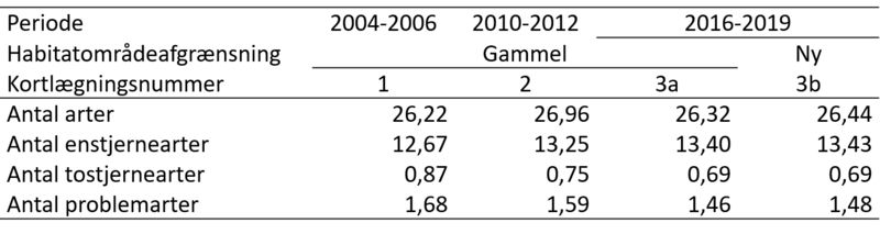 Det gennemsnitlige antal arter er nogenlunde uændret, mens antallet af enstjernearter stiger og antallet af problemarter og tostjernearter falder (Tabel 7230.103). Disse forskelle kommer til udtryk i en meget lille stigning i artstilstanden gennem de tre kortlægningsperioder (Figur 7230.102).