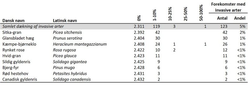 Der er registreret 1,5 problemarter i gennemsnit og de mest udbredte problemarter (der ikke er listet som invasive) er almindelig rapgræs og grå-pil (Tabel 7230.103.D) og de er registreret i knap 40 % af dokumentationscirklerne, mens stor nælde, kruset skræppe, mælkebøtte, burre-snerre, ager-padderok, og ager-tidsel forekommer mere sporadisk.