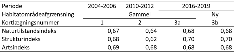 Naturtilstanden er en sammenvejning af naturtypens struktur- og artstilstand. Der er ikke væsentlige forskelle på struktur- og artstilstanden i og de gennemsnitlige indeksværdier ligger på hhv. 0,70 og 0,68 (Tabel 7150.102), ligesom arealandelen i høj og god tilstand er ens (hhv 96 og 94 % af arealet). Der er ikke nogen entydig udvikling i de gennemsnitlige indeksværdier i perioden (Tabel 7150.102), idet værdierne er en smule lavere i anden kortlægningsrunde end i den første og tredje. Der ses en stigning i andelen af arealet i de to høje naturtilstandsklasser for både natur-, struktur- og artstilstand (Figur 7150.102). Da det kortlagte areal med tørvelavning varierer gennem perioden (højest i den anden kortlægning), kan de gennemsnitlige ændringer ikke direkte tages som udtryk for omfanget af de forandringer i tilstanden, der er sket inden for habitatområderne.