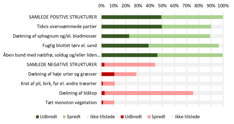 Som en del af strukturtilstanden er registreret en række positive og negative naturtypekarakteristiske strukturer, der er specifikke for den enkelte naturtype (link). Stor udbredelse af positive strukturer indikerer, at tørvelavning har lang græsningskontinuitet, frie dynamiske processer (fx i form af oversvømmelser) og er relativt upåvirkede af kulturindgreb i form af eutrofiering, afvanding eller tilgroning. Stor udbredelse af negative strukturer indikerer, at tørvelavningerne er stærkt kulturpåvirkede og at de dynamiske processer er begrænsede, eksempelvis ved fravær af græsning.