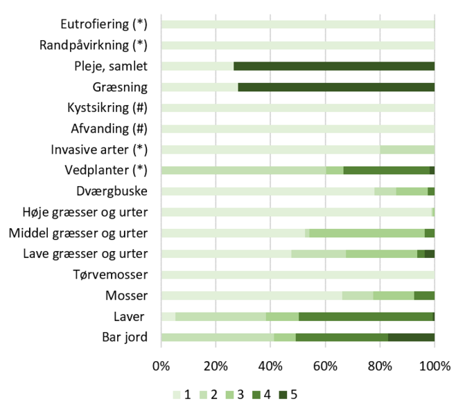 Fordelingen af strukturindikatorerne for den seneste kortlægning er vist i Figur 8220.103. Indlandsklippe er en meget variabel naturtype, hvor artssammensætningen afhænger af jordlagets tykkelse, klippernes hældning og eksponering samt det omkringliggende landskab. Klippernes hårde overflade og varierende tykkelse af jordlagt gør det stedvist vanskeligt for karplanterne at finde rodfæste. Dækningen af blottet substrat er derfor meget høj og omtrent halvdelen af arealet med indlandsklippe er dækningen over 30 %. Tilsvarende er dækningen af laver ganske høj, mens mosserne er noget mere spredt forekommende. Der er en relativt høj dækning af vedplanter, der har fundet fodfæste på afsatser samt i klippernes sprækker og revner eller som findes i det omgivende landskab, der for de lodrette klipper ofte er skov. Græs- og urtevegetationen er lavtvoksende og meget åben, mens dværgbuske er spredt forekommende og høje græsser og urter stort set er fraværende. Invasive plantearter er spredt forekommende (se også Tabel 8220.104). Der er græsning på to tredjedele af arealet med indlandsklippe og blot enkelte af de kortlagte arealer er forvaltet med høslæt eller slåning. Der er ikke registreret arealer med tydelig eutrofiering fra direkte gødskning og tilskudsfodring eller randpåvirkninger fra tilstødende marker. Omfanget af historisk og nutidig næringsstofbelastning er vanskelig at vurdere og i særdeleshed, når vurderingerne skal gøres i felten og på luftfotos samt på den skala kortlægningen foretages på. Vurderingerne af effekterne på habitattyperne vil derfor være forbundet med stor usikkerhed og vil sandsynligvis være underestimeret. Vurdering af tilgroning er lettere at foretage og dokumentere i felten baseret på ophobet plantemateriale og kolonisering af buske og træer.