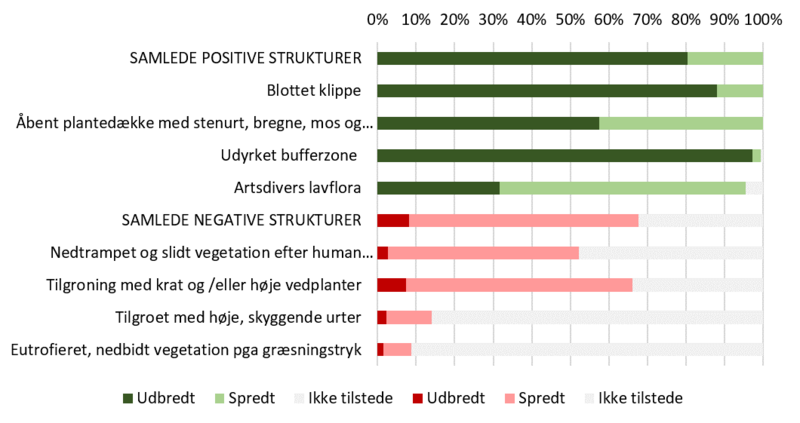 Der er registreret markant større udbredelse af positive end negative naturtypekarakteristiske strukturer i indlandsklippe (Figur 8220.104). Udyrket bufferzone og blottet klippe er de mest udbredte positive strukturer, mens tilgroning med krat og /eller rodfæstede høje vedplanter er den hyppigst registrerede negative struktur.