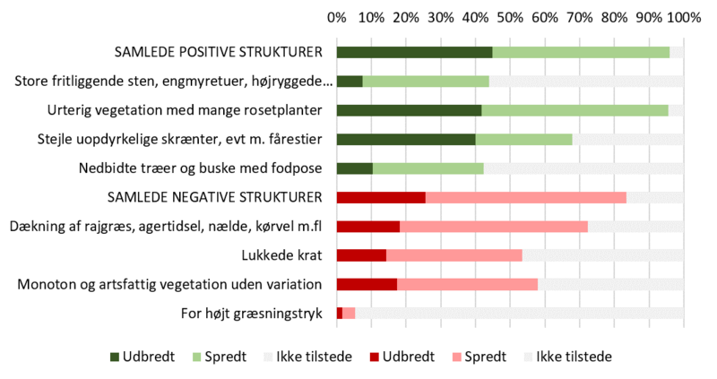 Som en del af strukturtilstanden er registreret en række positive og negative naturtypekarakteristiske strukturer, der er specifikke for den enkelte naturtype (link). De positive strukturer indikerer, at kalkoverdrev har lang græsningskontinuitet, frie dynamiske processer (fx i form af erosion) og er relativt upåvirkede af kulturindgreb i form af eutrofiering eller tilgroning. De negative strukturer indikerer, at kalkoverdrevene er stærkt kulturpåvirkede og at de dynamiske processer er begrænsede, eksempelvis ved fravær af græsning.