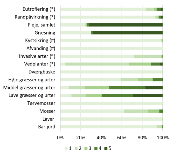 Fordelingen af strukturindikatorerne for den seneste kortlægning er vist i Figur 6210.103. Naturlige forstyrrelser, i form af græsning og erosion, formår kun i nogen grad at skabe og fastholde åbninger i vegetationen. Således har hovedparten af arealet med kalkoverdrev en dækning af bar jord på mindre end 5 %. Dækningen af laver er meget lav, mens mosserne er noget mere udbredte. Lave og middelhøje græsser og urter dominerer vegetationsdækket, mens høje græsser og urter er spredt forekommende og dværgbuske er fraværende. Vedplantedækningen er relativt høj og en tredjedel af det kortlagte areal har en vedplantedækning over 10 %, mens invasive plantearter er spredt forekommende (se også Tabel 6210.104). Der er græsning på tre fjerdedele af arealet med kalkoverdrev, mens en mindre andel af de kortlagte arealer er forvaltet med høslæt eller slåning. Der er registreret tydelig eutrofiering fra direkte gødskning og tilskudsfodring samt randpåvirkninger fra tilstødende marker på mindre end 10 % af arealet. Kontrolovervågningen har dog vist, at næringselskende arter er vidt udbredte på kalkoverdrev. Der kun er tegn på kystsikring på en ganske lille andel af arealet. Omfanget af historisk og nutidig næringsstofbelastning og betydningen af begrænsninger i den naturlige kystdynamik er vanskeligt at vurdere og i særdeleshed, når vurderingerne skal gøres i felten og på luftfotos samt på den skala kortlægningen foretages på. Vurderingerne af effekterne på habitattyperne vil derfor være forbundet med stor usikkerhed og vil sandsynligvis være underestimeret. Vurdering af tilgroning er lettere at foretage og dokumentere i felten baseret på ophobet plantemateriale og kolonisering af buske og træer.