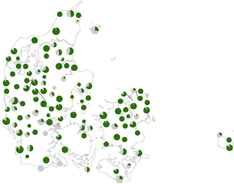 Den tredje kortlægning inden for den nye afgrænsning af habitatområderne (2016-2019) viser, at 67 % af arealet med tidvis våd eng og 68 % af forekomsterne med naturtypen har høj eller god naturtilstand (se Figur 6410.102). Ingen arealer har dårlig naturtilstand, mens blot 1 % af arealet og 3 % af forekomsterne har ringe naturtilstand og er dermed afhængige af en større indsats for at opnå en gunstig tilstand. Den gennemsnitlige indeksværdi for naturtilstand er på 0,65 for de 1.022 forekomster med tidvis våd eng (Tabel 6410.102). Justeringerne af Natura 2000-områdernes grænser har medført en mindre forøgelse af den gennemsnitlige tilstand (Figur 6410.102 og Tabel 6410.102). Figur 6410.101 viser andelen af de tidvis våde enge i høj eller god naturtilstand i de 115 habitatområder, hvor naturtypen er kortlagt inden for de nye afgrænsninger. Det ses, at der er stor forskel på tilstanden i de forskellige habitatområder, men ingen tydelige geografiske mønstre i fordelingen.