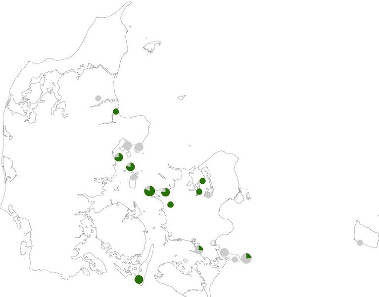 Den tredje kortlægning inden for den nye afgrænsning af habitatområderne (2016-2019) viser, at 55 % af arealet med tørt kalksandsoverdrev og 49 % af forekomsterne med naturtypen har høj eller god naturtilstand (se Figur 6120.102). Ingen arealer har dårlig naturtilstand, mens 3 % af arealet og 9 % af forekomsterne har ringe naturtilstand og er dermed afhængige af en større indsats for at opnå en gunstig tilstand. Den gennemsnitlige indeksværdi for naturtilstand er på 0,59 for de 68 forekomster med tørt kalksandsoverdrev (Tabel 6120.102). Justeringerne af Natura 2000-områdernes grænser har ikke medført væsentligt ændringer i den gennemsnitlige tilstand (Figur 6120.102 og Tabel 6120.102). Figur 6120.101 viser andelen af de tørre kalksandsoverdrev i høj eller god naturtilstand i de 19 habitatområder, hvor naturtypen er kortlagt inden for de nye afgrænsninger. Det ses, at der er stor forskel på tilstanden i de forskellige habitatområder, men ingen tydelige geografiske mønstre i fordelingen.