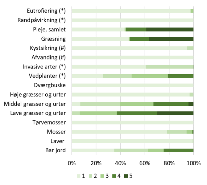 Fordelingen af strukturindikatorerne for den seneste kortlægning er vist i Figur 6120.103. Tørt kalksandsoverdrev er karakteriseret ved et stort indslag af enårige arter, der er afhængige af synlig bar jord mellem planterne. Naturlige forstyrrelser, i form af græsning og erosion af den lette og løse jord, har skabt åbninger i vegetationen på en relativt lille andel af de kortlagte arealer og mere end 60 % af arealet med tørt kalksandsoverdrev en dækning af bar jord på mindre end 10 %. På langt hovedparten af arealet er dækningen af laver under 5 %, mens mosserne er en smule mere udbredte. Lave græsser og urter dominerer vegetationsdækket og middelhøje græsser og urter er ret udbredte, mens dværgbuske og høje græsser og urter er meget spredt forekommende eller fraværende. Vedplantedækningen er høj, og halvdelen af det kortlagte areal har en vedplantedækning over 10 %. Invasive plantearter er spredt forekommende (se også Tabel 6120.104). Der er græsning på omtrent halvdelen af arealet med tørt kalksandsoverdrev, mens meget få kortlagte arealer er forvaltet med høslæt eller slåning. Der er stort set ikke registreret tydelig eutrofiering fra direkte gødskning og tilskudsfodring samt randpåvirkninger fra tilstødende marker. Kontrolovervågningen har dog vist, at næringselskende arter er vidt udbredte på tørt kalksandsoverdrev. Der kun er tegn på kystsikring på en ganske lille andel af arealet. Omfanget af historisk og nutidig næringsstofbelastning og betydningen af begrænsninger i den naturlige kystdynamik er vanskeligt at vurdere og i særdeleshed, når vurderingerne skal gøres i felten og på luftfotos samt på den skala kortlægningen foretages på. Vurderingerne af effekterne på habitattyperne vil derfor være forbundet med stor usikkerhed og vil sandsynligvis være underestimeret. Vurdering af tilgroning er lettere at foretage og dokumentere i felten baseret på ophobet plantemateriale og kolonisering af buske og træer.