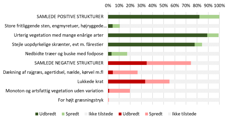 Som en del af strukturtilstanden er registreret en række positive og negative naturtypekarakteristiske strukturer, der er specifikke for den enkelte naturtype (link). Stor udbredelse af positive strukturer indikerer, at tørt kalksandsoverdrev har lang græsningskontinuitet, frie dynamiske processer (fx i form af erosion) og er relativt upåvirkede af kulturindgreb i form af eutrofiering eller tilgroning. Stor udbredelse af negative strukturer indikerer, at de tørre kalksandsoverdrev er stærkt kulturpåvirkede og at de dynamiske processer er begrænsede, eksempelvis ved fravær af græsning.