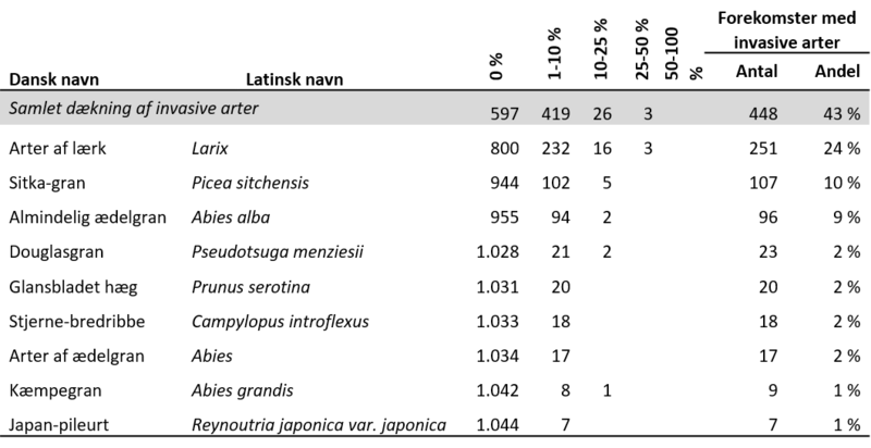 Der er registeret en eller flere invasive arter med en dækning på mere end 1 % på mere end to ud af fem af de kortlagte forekomster med bøg på mor inden for habitatområderne (Tabel 9110.103). På 3 % af forekomsterne er dækningen af invasive arter større end 10 %. Arter af lærk (almindelig europæisk lærk, japansk lærk og hybrid-lærk) udgør langt hovedparten af registreringerne og findes på 24 % af arealerne med bøg på mor. Derudover er fundet sitka-gran og almindelig ædelgran med en lav dækning på omtrent 1 % af forekomsterne, mens douglasgran, glansbladet hæg, stjerne-bredribbe, arter af ædelgran, kæmpegran og japan-pileurt findes på ganske få lokaliteter.