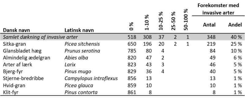 Der er registeret en eller flere invasive arter på to ud af fem kortlagte forekomster med skovbevokset tørvemose inden for habitatområderne (Tabel 91D0.103). Og på 5 % af skovbevokset tørvemoses arealer er dækningen af invasive arter større end 10 %. Sitka-gran udgør langt hovedparten af registreringerne og findes på 25 % af de skovbevoksede tørvemoser. Derudover er fundet glansbladet hæg, almindelig ædelgran, arter af lærk (europæisk, japansk og hybrid-lærk) og bjerg-fyr med en lav dækning på omtrent 1 % af forekomsterne, mens stjerne-bredribbe, hvid-gran og klit-fyr findes på ganske få lokaliteter.