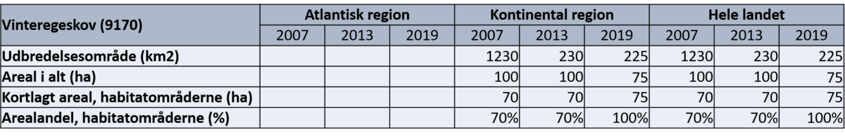 Tabel 9170.1. Udbredelsesområde og areal for vinteregeskov (9170) som afrapporteret til EU i 2007, 2013 og 2019. Den arealmæssige dækning af naturtypen er vist ved den samlede dækning i hele landet, det kortlagte areal inden for habitatområderne og andelen af det samlede areal, der ligger inden for habitatområderne. Arealerne er vist for de to biogeografiske regioner og for hele landet.