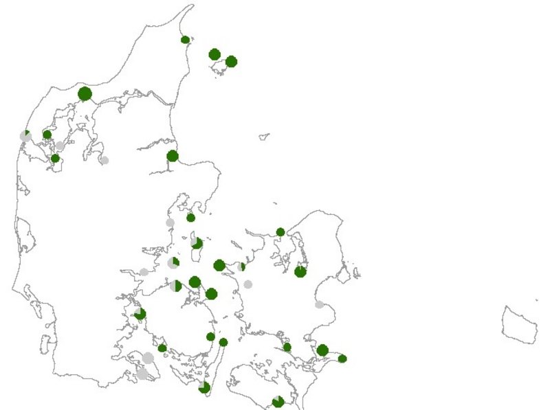 Den tredje kortlægning inden for den nye afgrænsning af habitatområderne (2016-2019) viser, at 80 % af arealet med strandvold med enårige planter og 71 % af forekomsterne med naturtypen har høj eller god naturtilstand (se Figur 1210.102). Et enkelt areal har dårlig - og ingen har ringe naturtilstand. Den gennemsnitlige indeksværdi for naturtilstand er på 0,67 for de 97 forekomster med strandvold med enårige planter (Tabel 1210.102). Justeringerne af Natura 2000-områdernes grænser har ikke medført væsentlige ændringer i den gennemsnitlige tilstand (Figur 1210.102 og Tabel 1210.102). Figur 1210.101 viser andelen af strandvold med enårige planter i høj eller god naturtilstand i de 35 habitatområder, hvor naturtypen er kortlagt inden for de nye afgrænsninger. Det ses, at der er stor forskel på tilstanden i de forskellige habitatområder, men ingen tydelige geografiske mønstre i fordelingen.