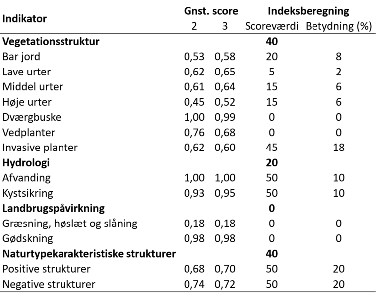 Strukturindekset er beregnet ud fra feltobservationer af en række indikatorer, der afspejler vegetationens struktur og påvirkningsfaktorer. Det gælder forekomsten af invasive plantearter, græsning/høslæt og en række naturtypekarakteristiske strukturer, modifikationer af hydrologi og kystdynamik samt landbrugsmæssige påvirkninger. Strukturindikatorernes udbredelse på de kortlagte arealer er registreret i kategorier, der hver især tildeles en score i forhold til den optimale fordeling for naturtypen. Eksempelvis er den optimale tilstand på strandvold med flerårige planter en høj dækning af bar jord, mens højden af græsser og urter er naturligt variabel (se Tabel 2-4 i Fredshavn og Nygaard 2014). Desuden vægtes indikatorerne indbyrdes i forhold til deres betydning for en gunstig tilstand for naturtypen. På strandvold med flerårige planter tillægges dækningen af bar jord og invasive plantearter, tegn på afvanding og kystsikring samt de naturtypekarakteristiske strukturer en relativt stor betydning for om strukturtilstanden er gunstig (Tabel 1220.105).