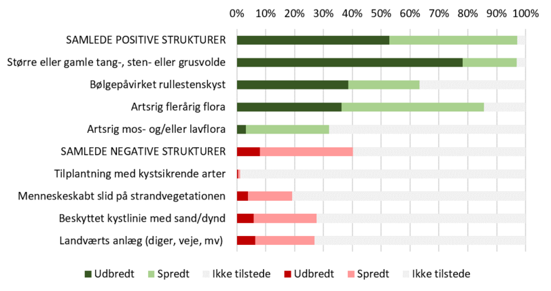 Som en del af strukturtilstanden er registreret en række positive og negative naturtypekarakteristiske strukturer, der er specifikke for den enkelte naturtype (link). Stor udbredelse af positive strukturer indikerer, at forekomsterne med strandvold med enårige planter har lang kontinuitet med frie dynamiske processer (i form af oversvømmelser og erosion) og er relativt upåvirkede af kulturindgreb. Stor udbredelse af negative strukturer indikerer, at de dynamiske processer er begrænsede, eksempelvis i form af kystsikring. Der er registreret meget større udbredelse af positive end negative naturtypekarakteristiske strukturer på strandvold med flerårige planter (Figur 1220.104). Større eller gamle tang-, sten- eller grusvolde, artsrig flerårig flora og bølgepåvirket rullestenskyst er de klart mest udbredte eksempler på positive strukturer, mens landværts anlæg i form af diger og veje og beskyttet kystlinje med sand eller dynd er de hyppigste eksempler på negative strukturer.
