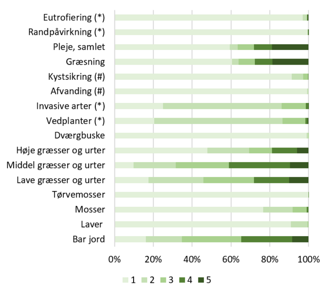 Fordelingen af strukturindikatorerne for den seneste kortlægning er vist i Figur 1220.103. Bar jord er meget udbredt (dog langt mindre end for strandvold med enårige planter) og at græs- og urtevegetationen fordeler sig nogenlunde lige på de tre størrelsesklasser; under 15, 15-50 og over 50 cm høj. Laver og mosser forekommer kun på en mindre andel af forekomsterne og typisk med en lav dækning. Vedplanter er fraværende på en femtedel af forekomsterne og dækningen er meget lav på hovedparten, hvilket hænger sammen med de naturlige forstyrrelser fra havet og at få danske arter af vedplanter er tilpasset salte levesteder, mens invasive plantearter er ret udbredte (se også Tabel 1220.104). Der er udbredt græsning på en femtedel af arealerne og græsning er fraværende på tre femtedele. Strandvoldene er naturligt næringsrige som følge af den kontinuere tilførsel af tang fra havet og grundet arealernes placering langs kysten, er der stort set ikke registreret tydelige tegn på direkte gødskning eller randpåvirkninger fra tilstødende marker. Der sker ikke afvanding af strandvolde og der er kun registreret tegn på en begrænsning af den naturlige kystdynamik på 8 % af strandvoldene. Omfanget af historisk og nutidig næringsstofbelastning, betydningen af begrænsninger i den naturlige kystdynamik og effekterne af afvanding og vandindvinding på de hydrologiske forhold er vanskeligt at vurdere og i særdeleshed, når vurderingerne skal gøres i felten og på luftfotos samt på den skala kortlægningen foretages på. Vurderingerne af effekterne på habitattyperne vil derfor være forbundet med stor usikkerhed og vil sandsynligvis være underestimeret. Vurdering af tilgroning er lettere at foretage og dokumentere i felten baseret på ophobet plantemateriale og kolonisering af buske og træer.