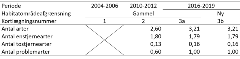 Det gennemsnitlige antal arter og problemarter er noget højere i tredje end i anden kortlægning, mens antallet af enstjernearter er uændret og antallet af tostjernearter er en smule højere (Tabel 1320.103). Disse forskelle kommer til udtryk i et markant fald i artstilstanden fra anden til tredje kortlægningsperiode (Figur 1320.102).