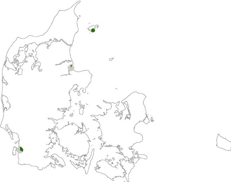 Den tredje kortlægning inden for den nye afgrænsning af habitatområderne (2016-2019) viser, at 26 % af arealet med vadegræssamfund og 37 % af forekomsterne med naturtypen har høj eller god naturtilstand (se Figur 1320.102). Ingen arealer har dårlig naturtilstand, mens hele 73 % af arealet og 58 % af forekomsterne har ringe naturtilstand og afhængig af en større indsats for at opnå en gunstig tilstand. Den gennemsnitlige indeksværdi for naturtilstand er på 0,46 for de 19 forekomster med vadegræssamfund (Tabel 1320.102). Justeringerne af Natura 2000-områdernes grænser har ikke medført ændringer i den gennemsnitlige tilstand (Figur 1320.102 og Tabel 1320.102). Figur 1320.101 viser andelen af vadegræssamfund i høj eller god naturtilstand i de 5 habitatområder, hvor naturtypen er kortlagt inden for de nye afgrænsninger. Det ses, at der er stor forskel på tilstanden i de forskellige habitatområder, men ingen tydelige geografiske mønstre i fordelingen.