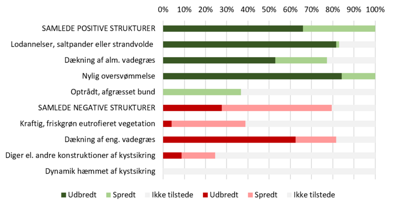 Som en del af strukturtilstanden er registreret en række positive og negative naturtypekarakteristiske strukturer, der er specifikke for den enkelte naturtype (link). Stor udbredelse af positive strukturer indikerer, at forekomsterne med vadegræssamfundene har frie dynamiske processer (i form af oversvømmelser og erosion) og er relativt upåvirkede af kulturindgreb i form af omlægning og afvanding. Stor udbredelse af negative strukturer indikerer, at de dynamiske processer er begrænsede, eksempelvis i form af kystsikring og om invasive plantearter er udbredte.